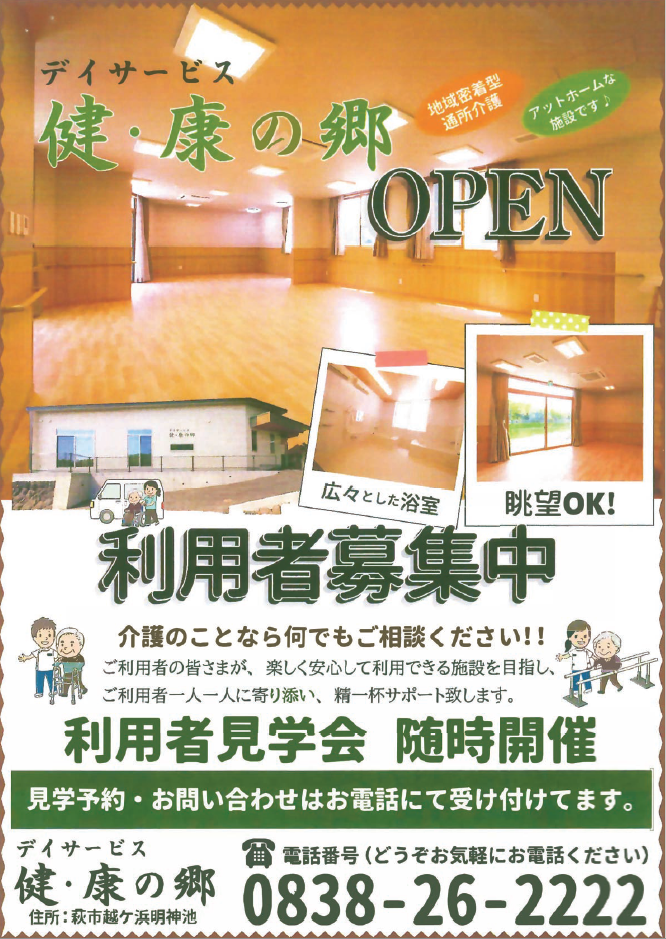 施設の中は、とても明るく、広々としており、窓も大きく、何より一番は越ケ浜の代表する明神池を一望しながら食事や団欒を楽しむことが出来ることが、他には無い最大の特徴です。 利用者様たちが喜ばれることが、亡き父も何よりも幸せと感じていることと思います。 社会福祉法人“健香会”、 “皆さんがいつまでも健康でい続けること”、“私の故郷”に、ちなんで、 “健康の郷”と名付けました。 是非一度ご覧下さい。お待ちしております。